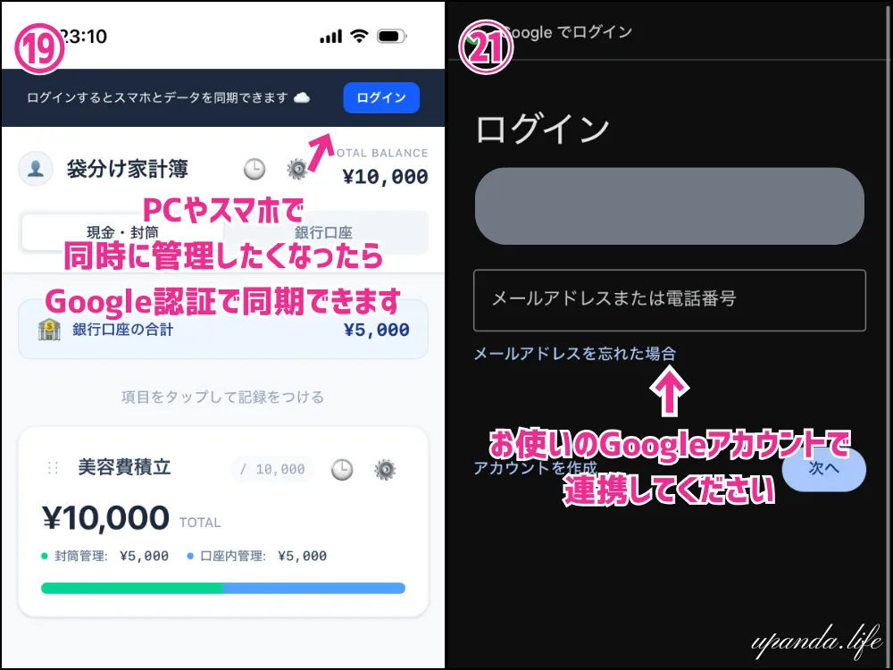 「PCやスマホでも見たい!」と思ったり、「これからもこの家計簿を使い続けてみたい」と思ったら、Googleアカウントでの連携もできます。