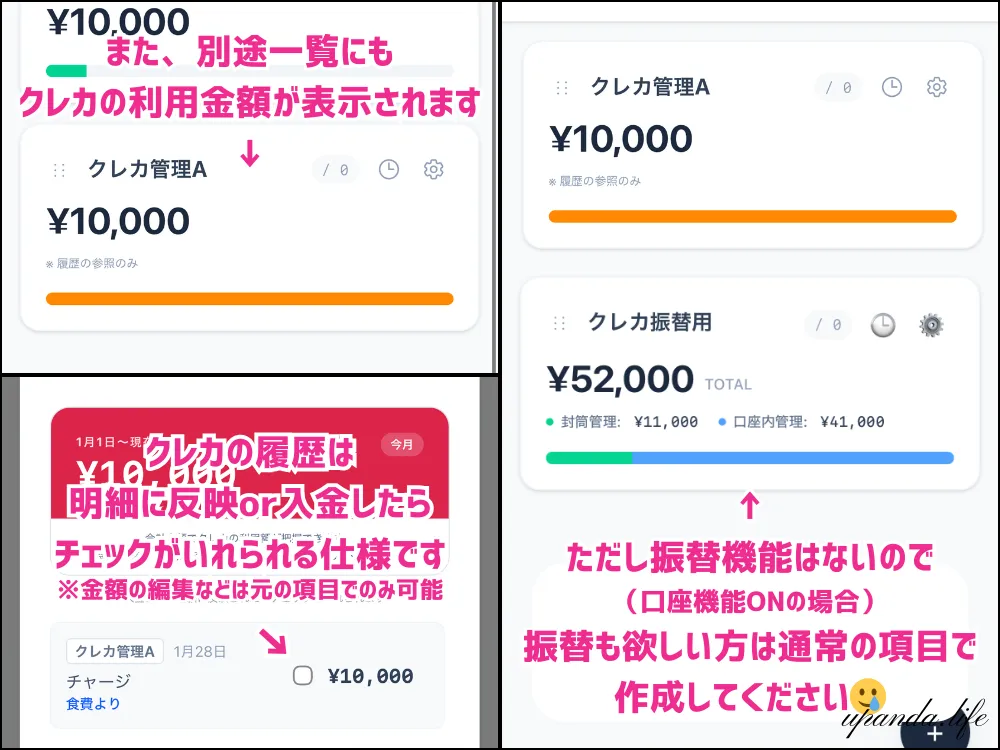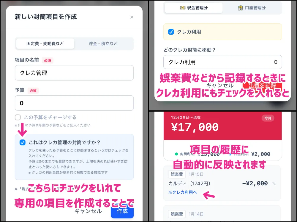 こちらはクレカを使ったら専用の封筒に現金を移し替える方向けの機能です。
