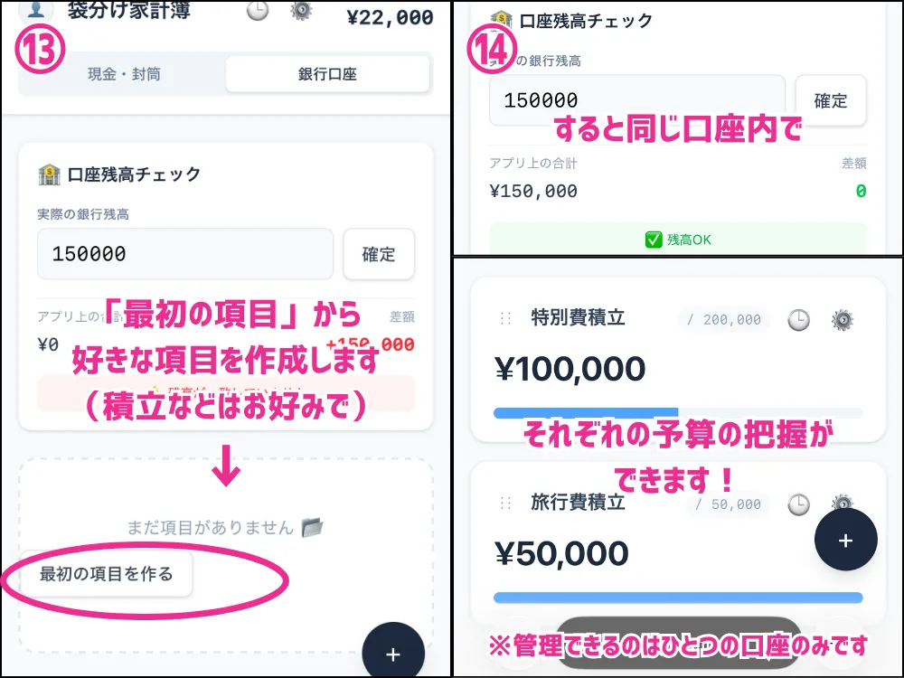 こちらは同じ口座内で特別費や旅行費などを項目ごとに分けられる機能になります。(※口座を連携するわけではありません)