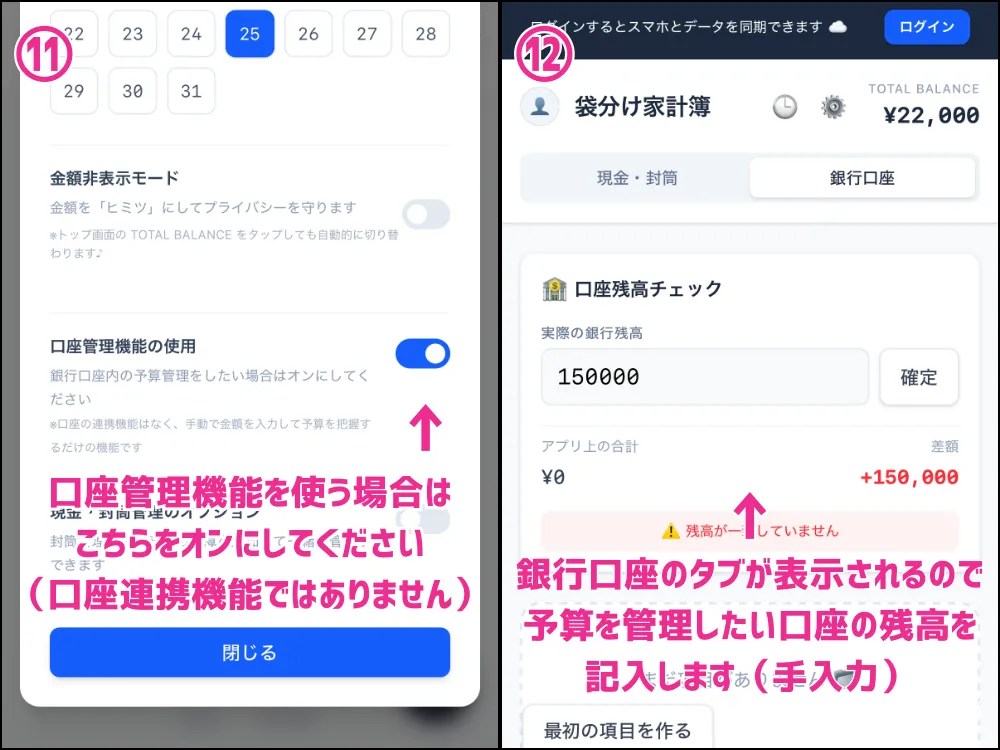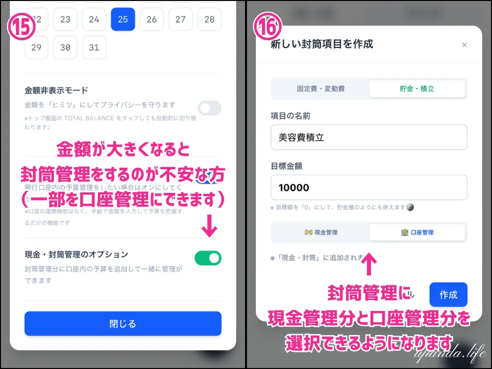 こちらは封筒管理の金額の一部を口座内で管理できる機能です。