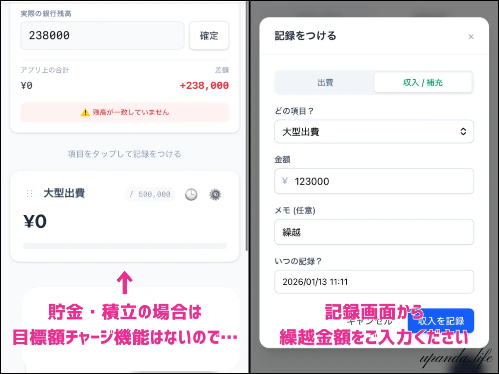 ※予算は毎月繰越となるので、残金リセットなどを行う際は、出費で「メモ:残し貯め」などにしてご利用ください。